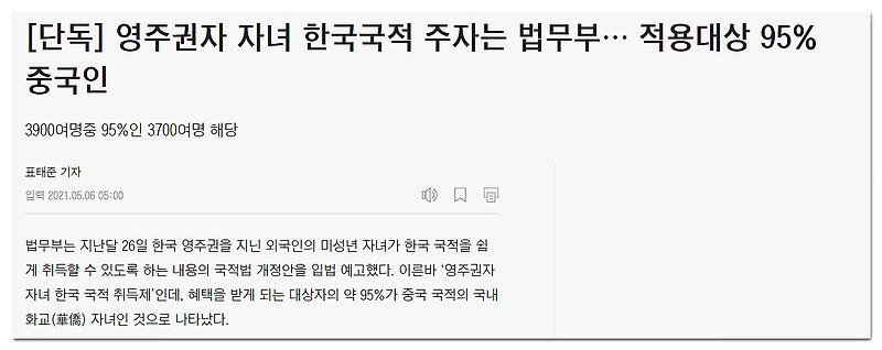 사회국적법 개정 반대 청원 30만...법무부 "사회 통합 고려" | YTN from image.ytn.co.kr '중국 속국' 논란 국적법 개정안 반대 청원 20만명 돌파. 청와대의 직접 소통은 국민이 물으면 정부가 답한다 는 철학을 지향합니다. 현재 미국에서 엄청 까이고 있는 존시나 82. 여러분 법무부에서 영주권자 자녀에게 한국 국적을 준다고 합니다 그 수혜자 중 95프로는 중국인인데요 이건 나라를 파는 행위입니다 문재인정부 실검 폐지 때문에 대부분의 국민들이 인지를 못하고 계시는데 가능하면 국적법 개정안 반대 청원해주시고 많은 관심 가져주세요 네이버에 국적법 개정안 청원. 청와대 '국적법 개정안' 반대 청원 20만 명 육박 한국서 태어난 영주권자 자녀, 화교·재외동포 우선 대상 국내 출생 6세 이하 무조건·7세 이상 5년 이상 거주해야 법무부 저출산 고령화 시대 미래 인적 자원 확보 기여 외국인들 과도한 혜택 vs 언제까지 한민족 타령인가. 제1조(목적) 이 법은 대한민국의 국민이 되는 요건을 정함을 목적으로 한다. 국적법 대상 화교냐 조선족이냐 1. 그동안 영주권자 자녀는 국내에서 태어나 정규 교육과정을 이수했더라도 부모가 한국 국적을 얻지 않으면 성년이 된 후 귀화.