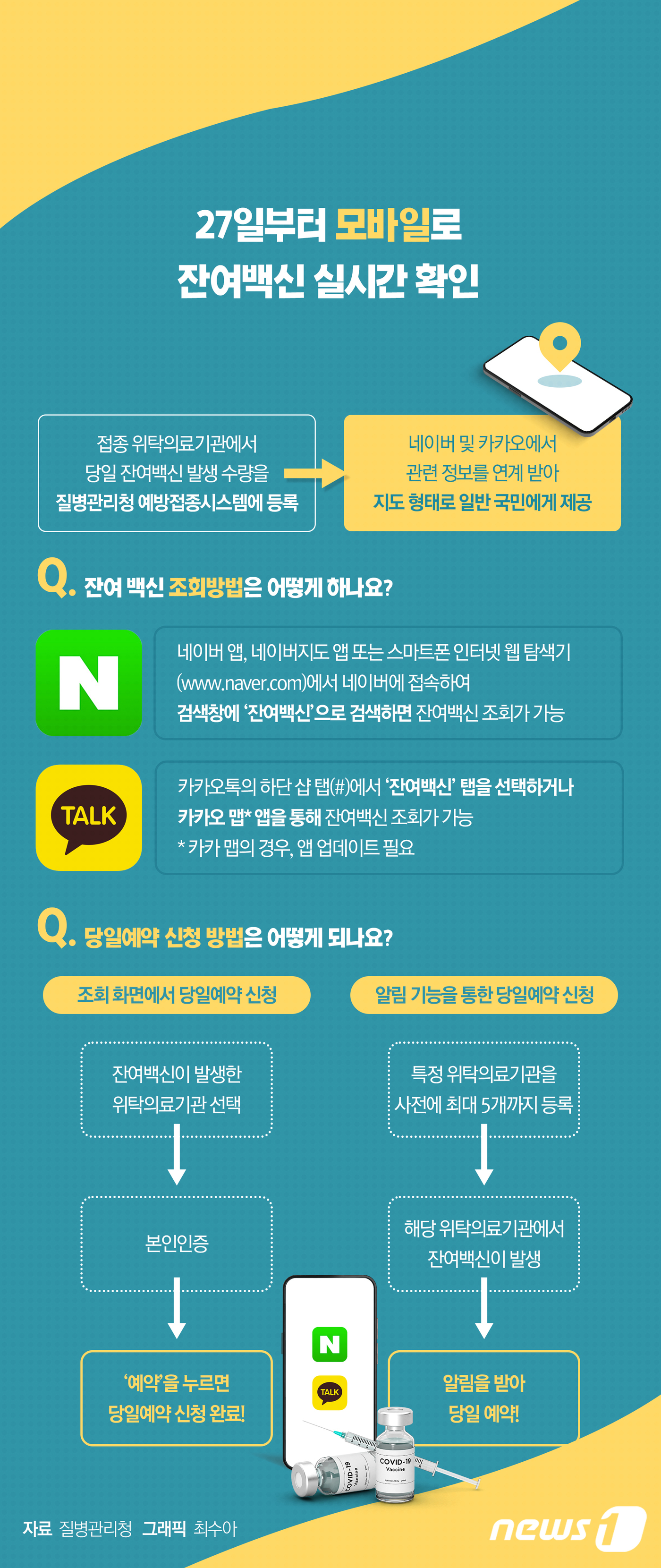이 서비스는 27일부터 2주간 시범운영된다. 그냥 별 생각없이 네이버에서 신청 했더니 바로 한방에 접수되어 바로 뛰어가서 맞고 왔습니다. 오늘 노쇼로 남은 잔여백신 신청해서 맞고 왔는데요 생각보다 쉽게 되네요. 27일부터 네이버·카카오로 잔여백신 당일 접종 예약 가능. 27일부터 네이버·카카오 통해 잔여백신 접종 예약 가능|코로나19 중앙방역대책본부 브리핑 (21.5.25.)